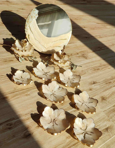 هفت سین طرح مرمر رزینی شیک لب طلایی شامل آینه یک جفت شمعدون پایه آینه 6 عدد پیاله هفتسین و استند سبزه و کاسه ماعی