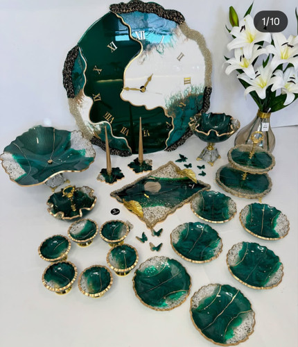 سرویس و ظروف پذیرایی رزینی سرویس کامل6نفره جهیزیه ب همراه ساعت قطر۶۰ و جاکلیدی