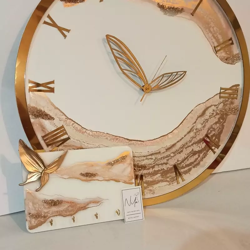 ساعت دیواری خاص قطر۵۰ رزینی به همراه جاکلیدی ست کرم طلایی