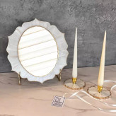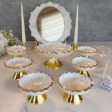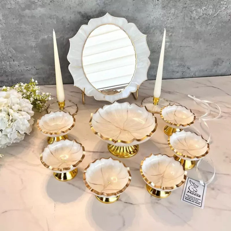 هفت سین طرح مرمر رزینی شیک لب طلایی شامل آینه یک جفت شمعدون پایه آینه 6 عدد پیاله هفتسین و استند سبزه