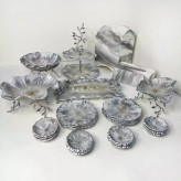 سرویس پذیرایی ۶نفره شامل میوهخوری قطر ۳۰ ،آجیل خوری ،شکلات خوری، یک عدد اردوخوری، ۶عدد پیاله، ۶عدد پیشدستی قطر۲۰، یک عدد سینی گرد قطر۳۰ و یک عدد شیرینی خوری دو طبقه ابعاد طبقات ۳۰ و ۲۵ سانت میباشد و سطل و جا دستمال چوبی رزینی