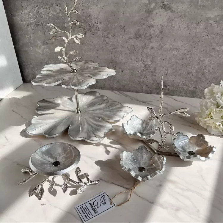 سرویس پذیرایی شامل میوهخوری بزرگ قطر ۴۰ ،آجیل خوری ، یک عدد شکلات خوری،یک عدد باکس تیبگ کوچک،یک عدد استند دوتایی پایه فلزی،یک عدد قندان،و یک عدد اردوخوری سه پیالهای،یک عدد شیرینی خوری دو طبقه ابعاد طبقات ۳۰ و ۲۵ سانت میباشد