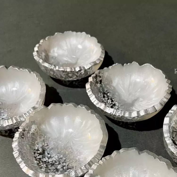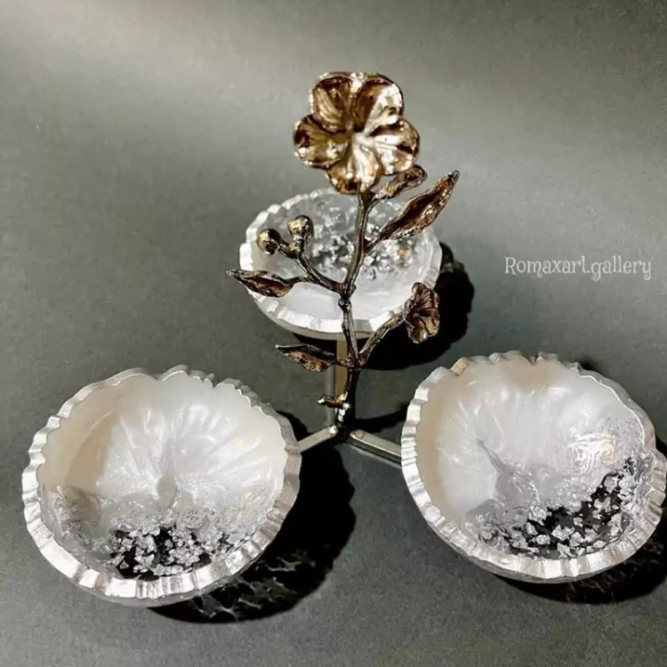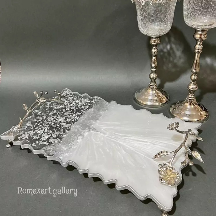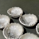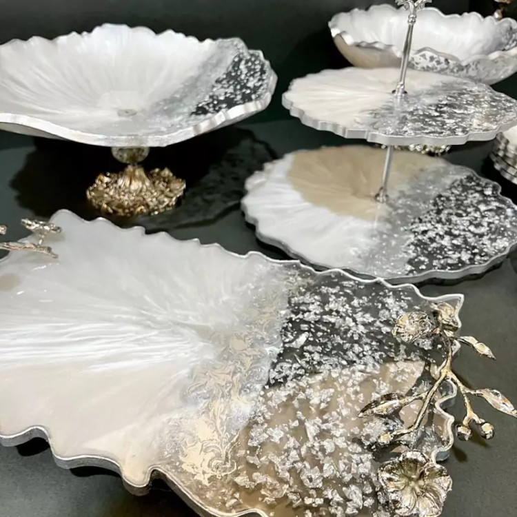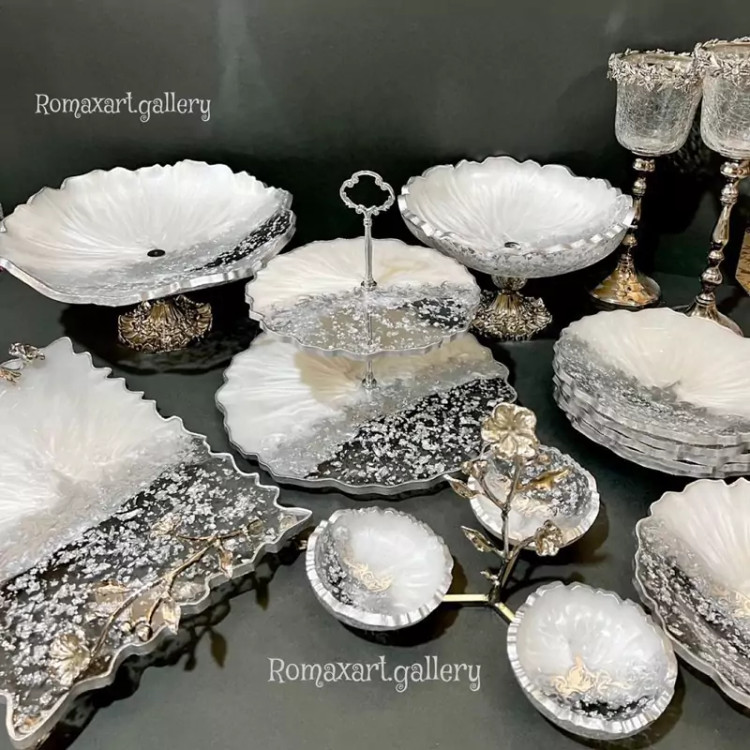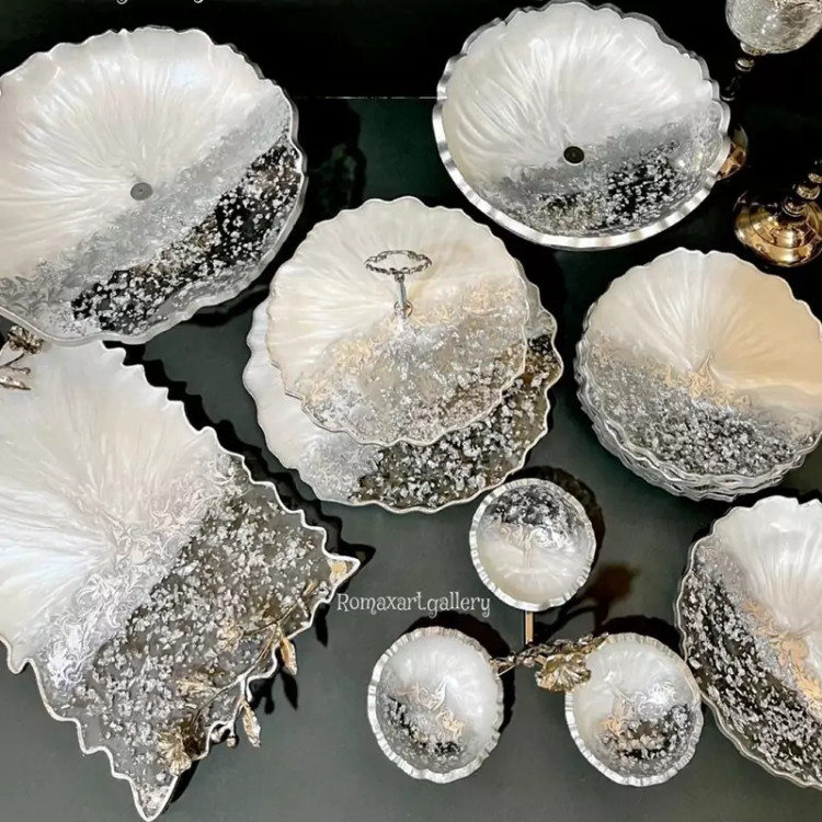 ست و سرویس پذیرایی رزینی ۶ نفره شیک صدفی نقره ای با تکه های ورق نقره