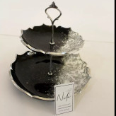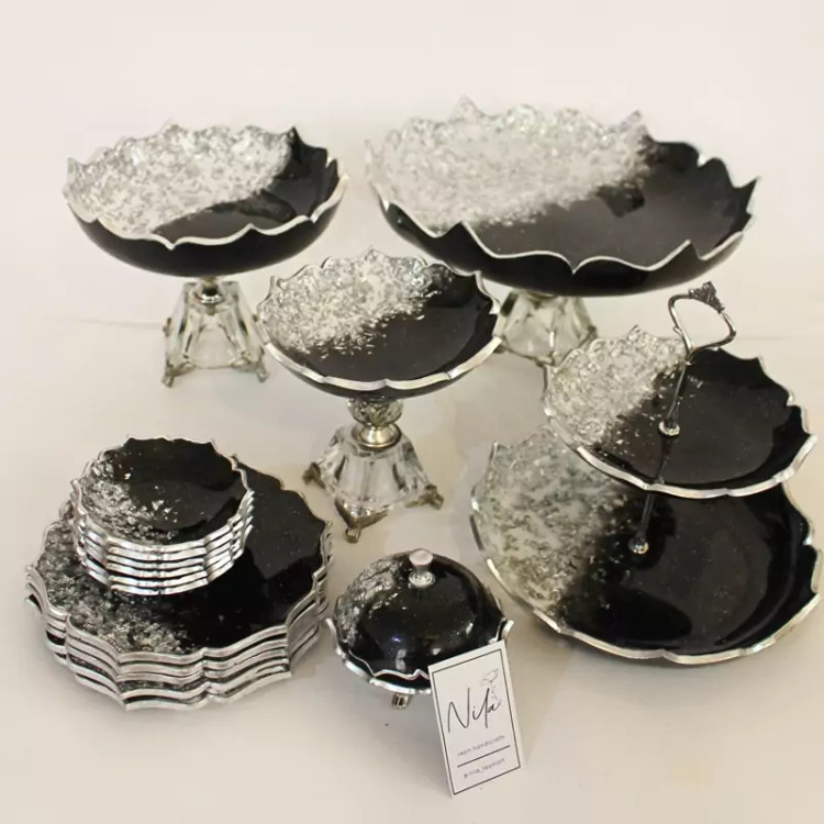 ظروف پذیرایی ۶نفره زینی مشکی نقره ای شیک (رزینی)با تکه های ورق نقره