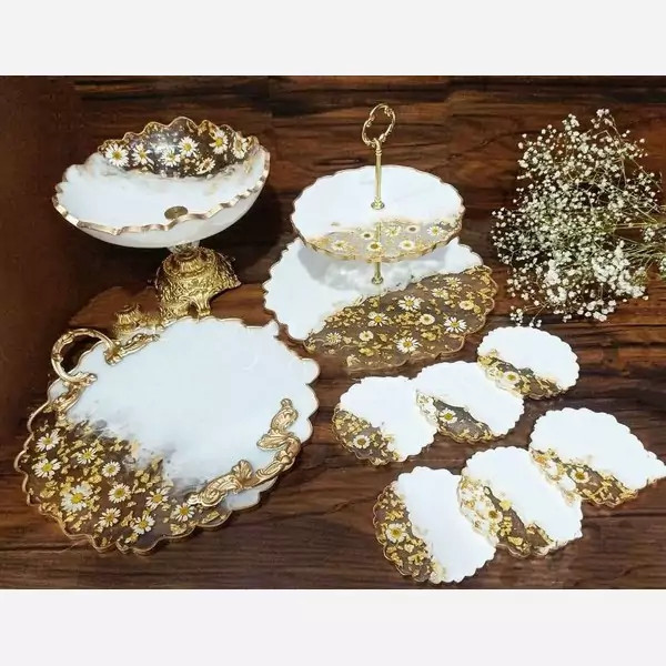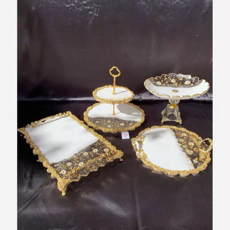 سرویس پذیرایی ۶نفره شامل میوهخوری قطر ۳۰ ،آجیل خوری ،شکلات خوری، یک عدد اردوخوری، ۶عدد پیاله، ۶عدد پیشدستی قطر۲۰، یک عدد سینی گرد قطر۳۰و یک عدد شیرینی خوری دو طبقه ابعاد طبقات ۳۰ و ۲۵ سانت میباشد