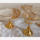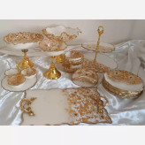 سرویس پذیرایی ۶نفره شامل میوهخوری قطر ۳۰ ،آجیل خوری ،شکلات خوری، یک عدد اردوخوری، ۶عدد پیاله، ۶عدد پیشدستی قطر۲۰، یک عدد سینی مستطیل طول۳۰, یک عدد شیرینی خوری دو طبقه ابعاد طبقات ۳۰ و ۲۵ سانت میباشد