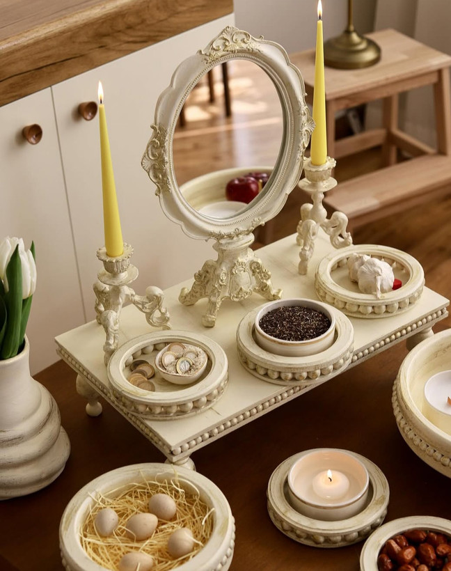 دیدن محصولات مرتبطست کامل هفت سین چوبی شامل آینه و شمعدان پلی استر ۶ پیاله رایزردار چوبی یه پیاله بزرگتر چوبی رایزر و یک کاسه بزرگ رایزر چوبی
