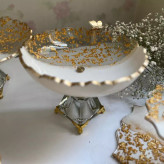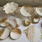 سرویس پذیرایی ۶نفره شامل میوهخوری قطر ۳۰ ،آجیل خوری ،شکلات خوری، یک عدد اردوخوری، ۶عدد پیاله، ۶عدد پیشدستی قطر۲۰، یک عدد سینی گرد قطر۳۰ز و یک عدد شیرینی خوری دو طبقه ابعاد طبقات ۳۰ و ۲۵ سانت میباشد و یک اردو خوری