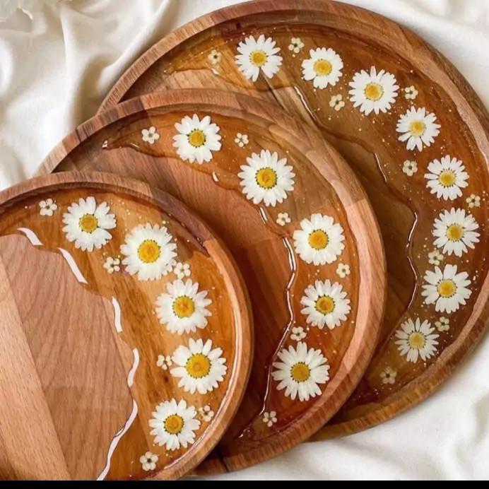 سینی گرد چوبی رزینی طرح بابونه مجموعه سه عددی