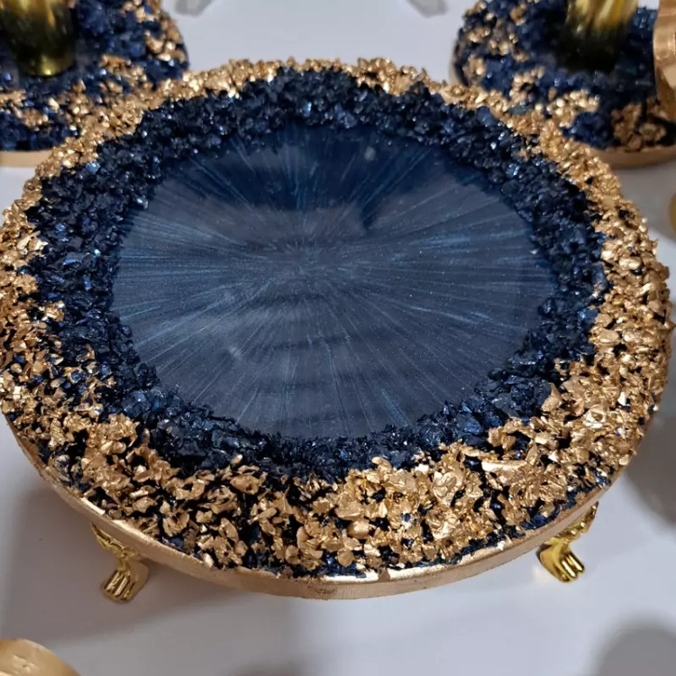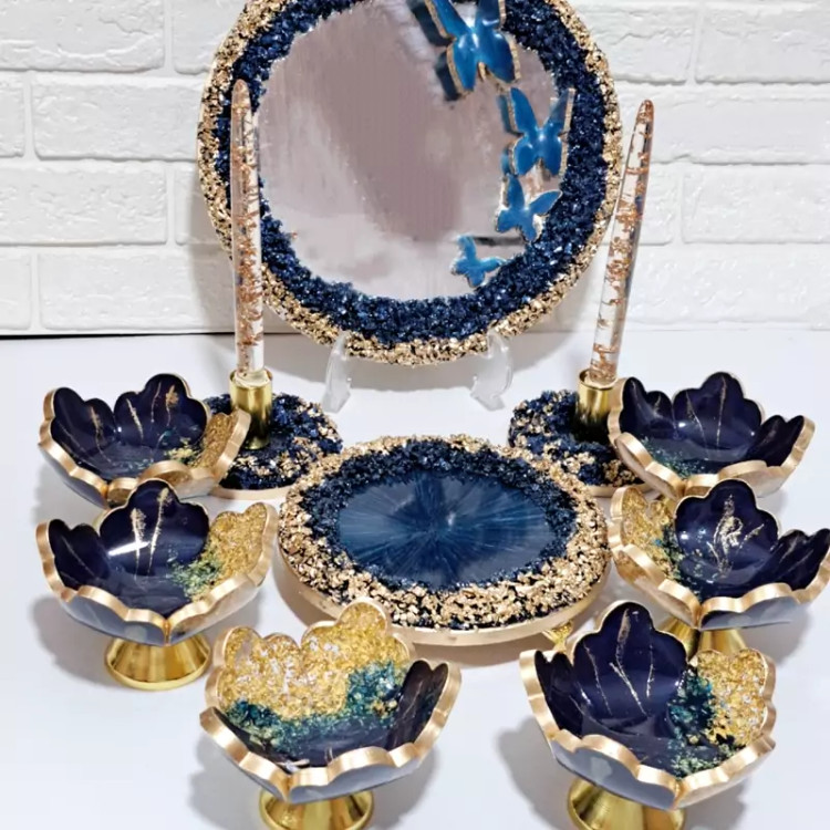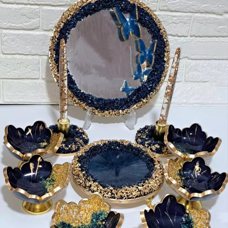 هفت سین رزینی پایه دار 6 پیاله پایه دار دو جاشمعی آینه 30 سانتی کار شده با سنگ جای سبزه 20 سانتی پایه دار
