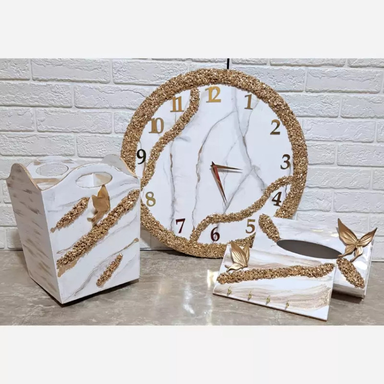 ست ساعت رزینی 60 سانت ب همراه سطل و جا دستمال و جاکلیدی جهیزیه عروس
