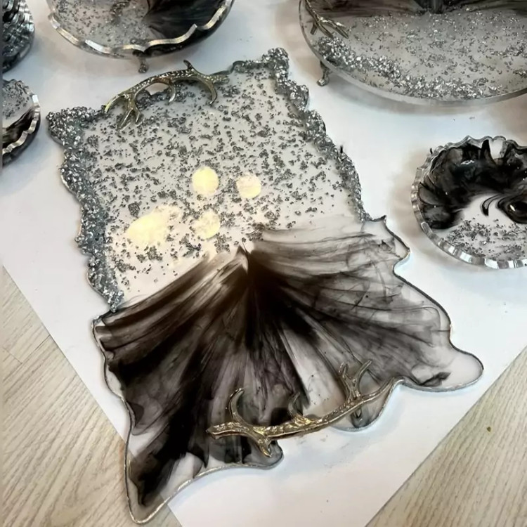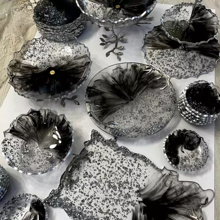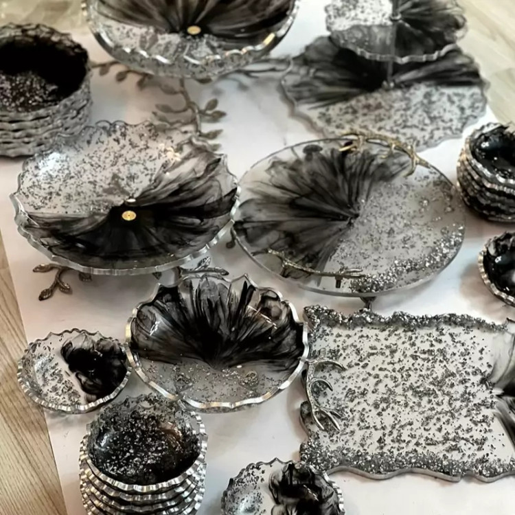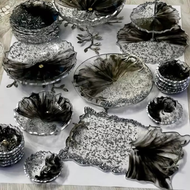 سرویس پذیرایی ۶ نفره شامل میوهخوری قطر۳۰ ،آجیل خوری ،شکلات خوری، ۶ عدد پیاله ، ۶ عدد پیشدستی قطر۲۰، یک عدد سینی مستطیل بزرگ طول۳۰ و یک عدد شیرینی خوری دو طبقه ابعاد طبقات ۳۰ و ۲۵ سانت و یک سینی گرد سرو میباشد