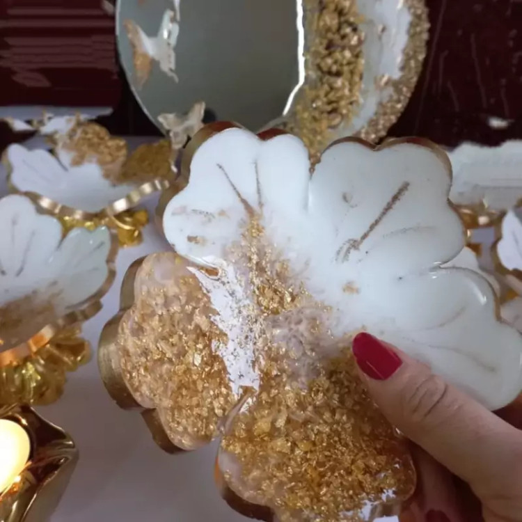 سرویس هفت سین رزینی ۶ عدد پیاله پایه دار کار شده با ورق طلا آینه ۳۰ سانتی کار شده با سنگ طلایی دو عدد جا شمعی