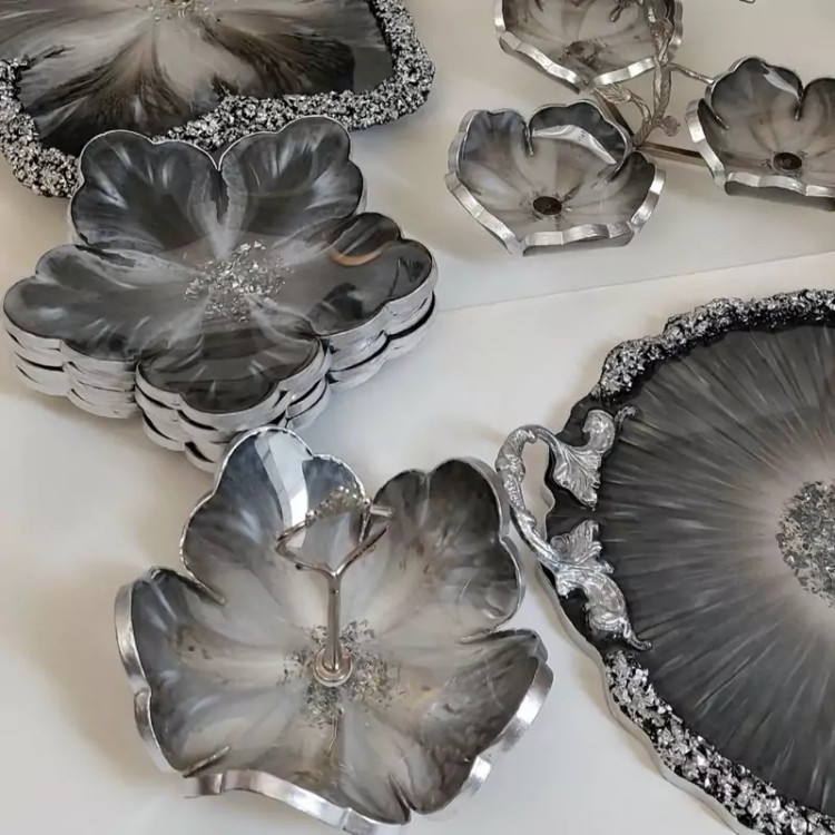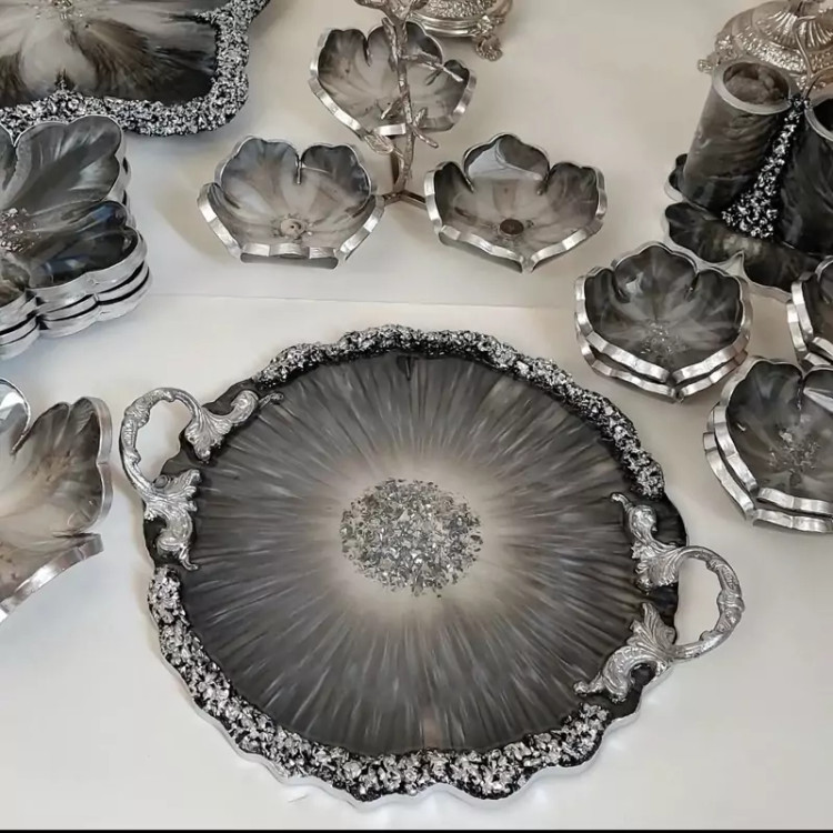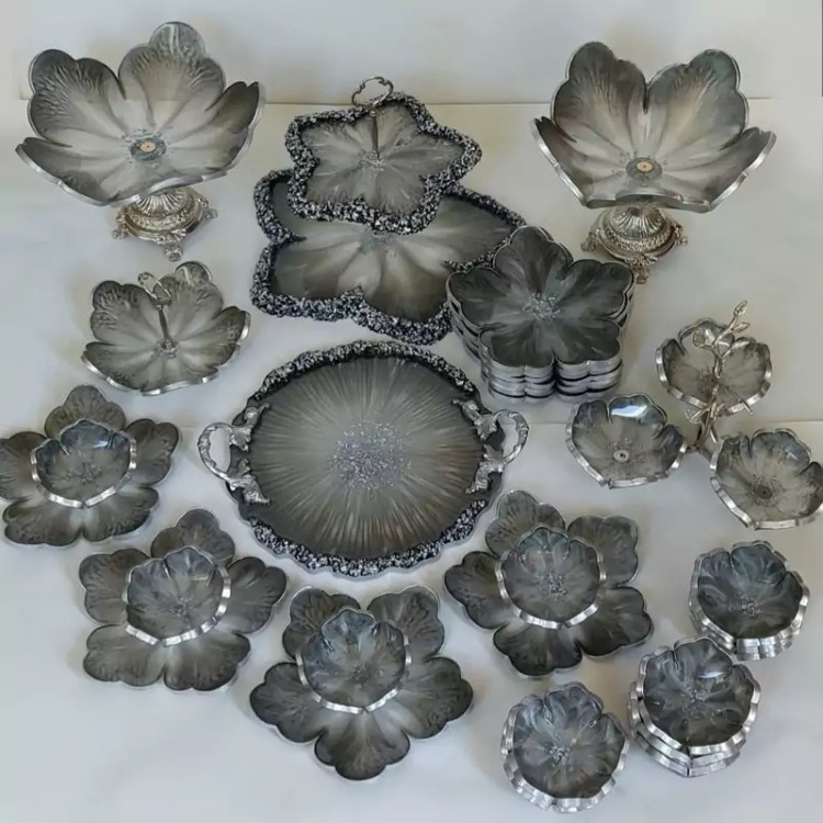 سرویس پذیرایی ۶نفره شامل میوهخوری قطر ۳۰ ،آجیل خوری ،شکلات خوری، یک عدد اردوخوری، ۶عدد پیاله، ۶عدد پیشدستی قطر۲۰، یک عدد سینی گرد قطر۳۰ز و یک عدد شیرینی خوری دو طبقه ابعاد طبقات ۳۰ و ۲۵ سانت میباشد و یک اردو خوری