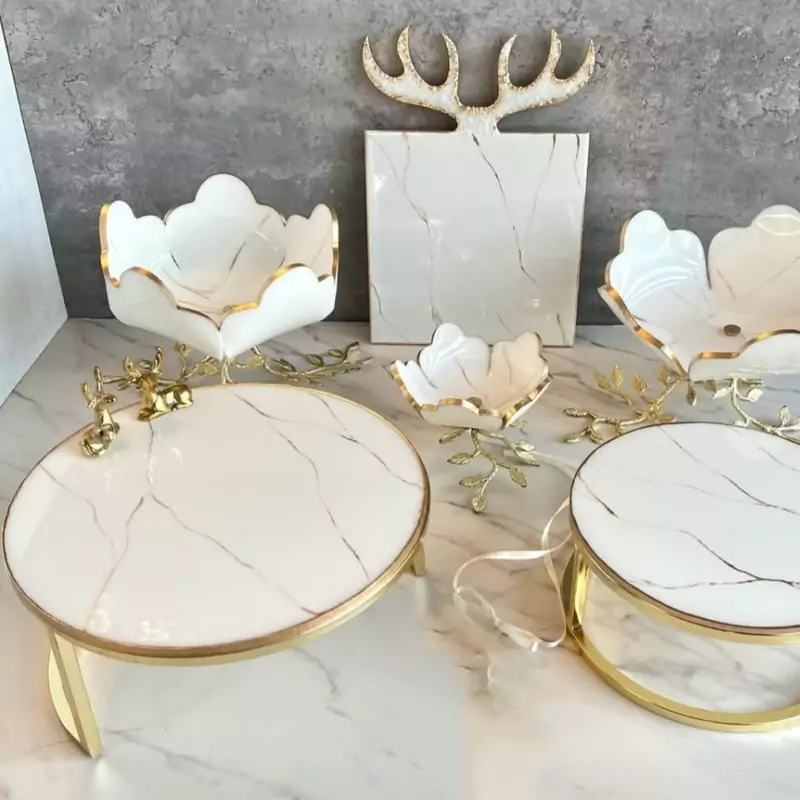 سرویس ظروف پذیرایی سفید طلایی رزینی 5تکه پایه برنجی