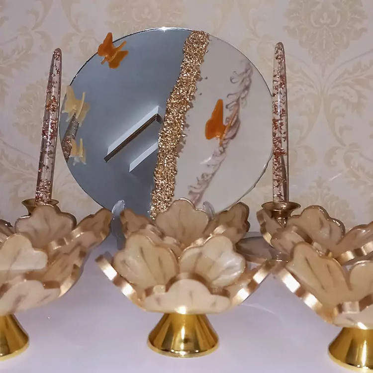 سرویس تمام رزین طلایی با پایه فلز آبکاری شده ۶ پیاله اینه ۳۰ سانت کار شده با سنگ دو جاشمعی