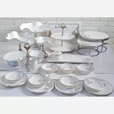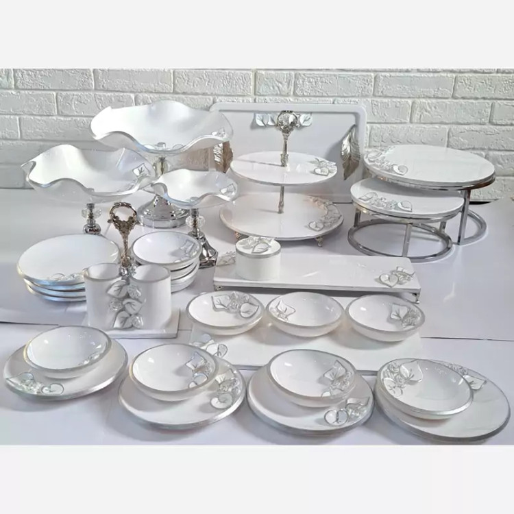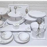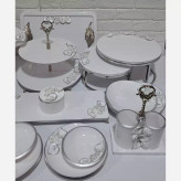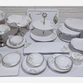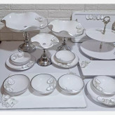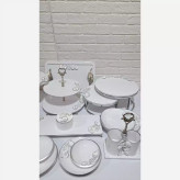 سرویس پذیرایی۶نفره شامل میوهخوری بزرگ قطر ۴۰ ،آجیل خوری ،شکلات خوری، یک عدد اردوخوری، ۶عدد پیاله ،۶عدد پیشدستی قطر۲۰، یک عدد سینی مستطیل بزرگ طول۴۰ و یک عدد شیرینی خوری دو طبقه ابعاد طبقات ۳۰ و ۲۵ سانت میباشد و یک عدد قندان یک استند کارد و چنگال یک عدد رولت خوری و یه استند دوتایی سرو