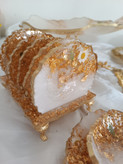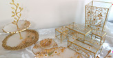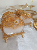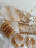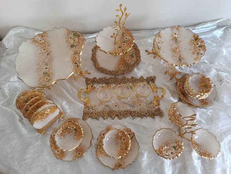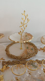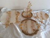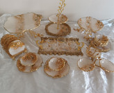 میوه خوری بزرگ قطر40,اجیل خوری،شکلات خوری،اردوخوری،شیرینی خوری دو طبقه،سینی گرد قطر 40یا سینی مستطیل طول40 ب انتخاب خودتون،6تا پیاله،6تا پیش دستی،6تا زیر استکانی6تا فنجون لب طلایی،سطل و جا دستمال شیشه ای،دو عدد قندان و یه باکس کارد و چنگال دارد