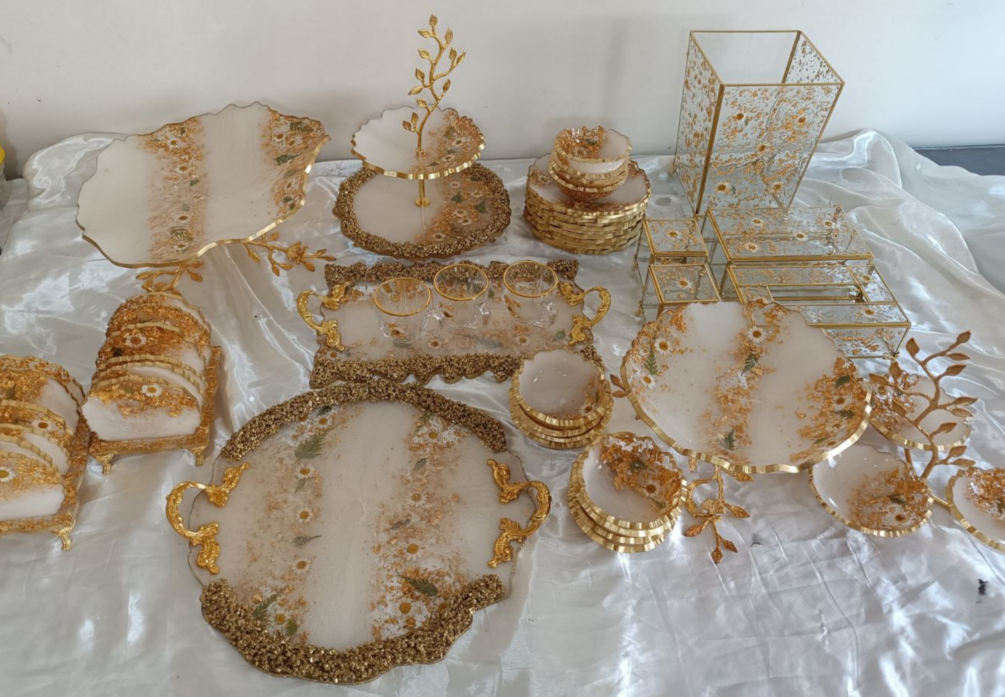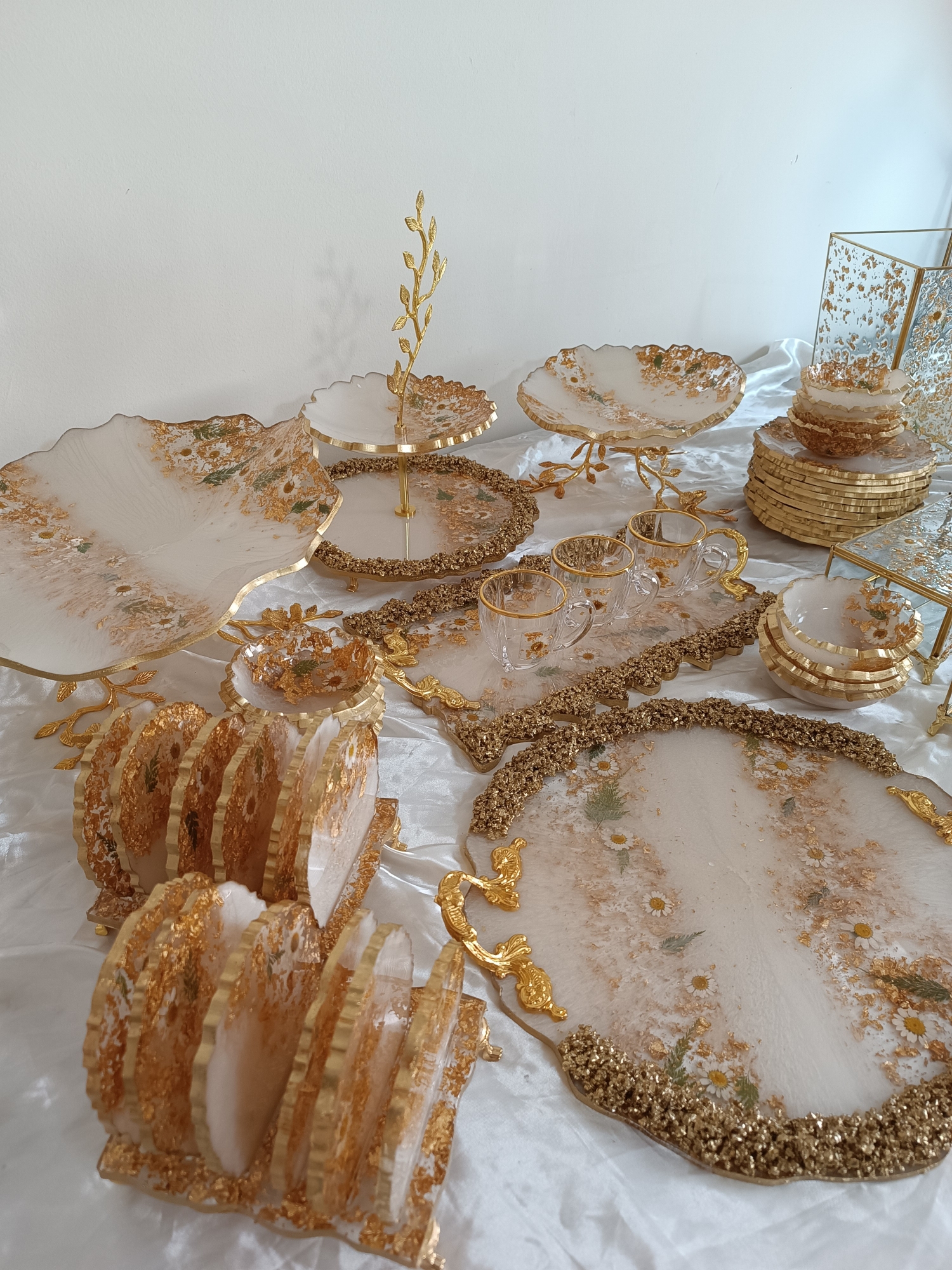 میوه خوری بزرگ قطر40,اجیل خوری،شکلات خوری،اردوخوری،شیرینی خوری دو طبقه،سینی گرد قطر 40یا سینی مستطیل طول40 ب انتخاب خودتون،6تا پیاله،6تا پیش دستی،6تا زیر استکانی6تا فنجون لب طلایی،سطل و جا دستمال شیشه ای،دو عدد قندان و یه باکس کارد و چنگال دارد