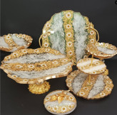 سرویس پذیرایی ۵تکه ب همراه قندان شامل میوهخوری قطر ۳۰ ،آجیل خوری ،شکلات خوری، یک عدد سینی گرد قطر۳۰ و یک عدد شیرینی خوری دو طبقه ابعاد طبقات ۳۰ و ۲۵ سانت میباشد و یک قندان