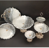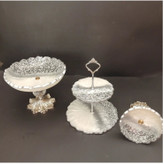سرویس پذیرایی ۶ن تکه شامل میوهخوری قطر ۳۰ ،آجیل خوری ،شکلات خوری، یک عدد سینی گرد قطر۳۰ و یک عدد شیرینی خوری دو طبقه ابعاد طبقات ۳۰ و ۲۵ سانت میباشد و یک قندان پایه دار قطر۱۵