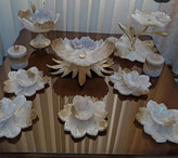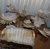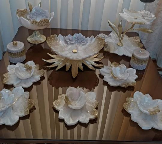 سرویس پذیرایی ۶ نفره شامل میوهخوری قطر ۳۰،آجیل خوری ،شکلات خوری، یک عدد اردوخوری، ۶ عدد پیاله ، ۶ عدد پیشدستی قطر۲۰، یک عدد سینی مستطیل بزرگ طول۴۰ و یک عدد شیرینی خوری دو طبقه ابعاد طبقات ۳۰ و ۲۵ سانت میباشد
