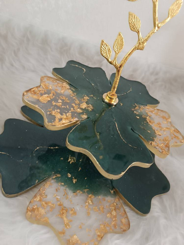 سرویس پذیرایی ۴تکه ب همراه پیش دستی شامل میوهخوری قطر ۳۰ ،شکلات خوری،۶عدد پیشدستی قطر۲۰، یک عدد شیرینی خوری دو طبقه ابعاد طبقات ۳۰ و ۲۵ سانت میباشد و استند کارد و چنگال