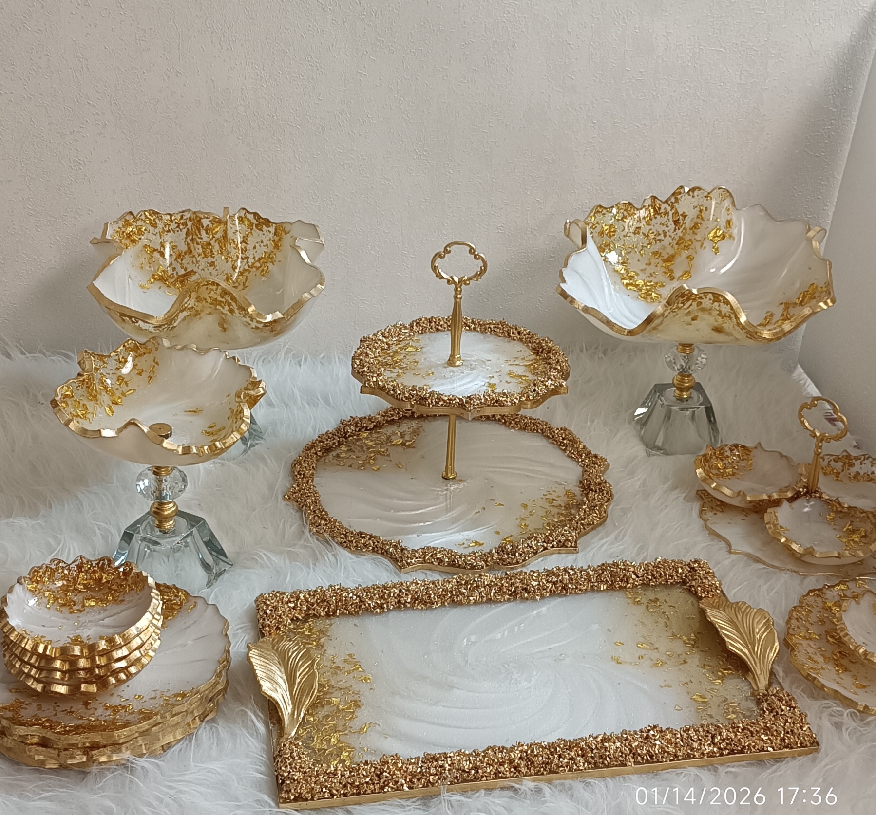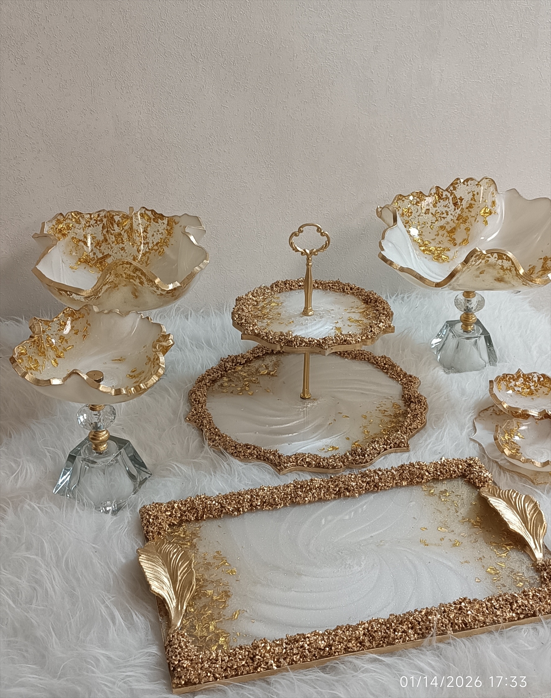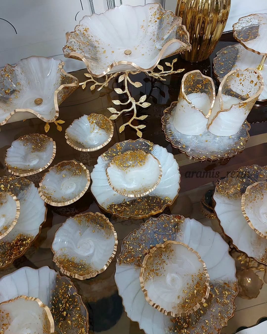 سرویس پذیرایی رزینی ۱۲نفره جهیزیه عروس سفید طلایی