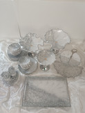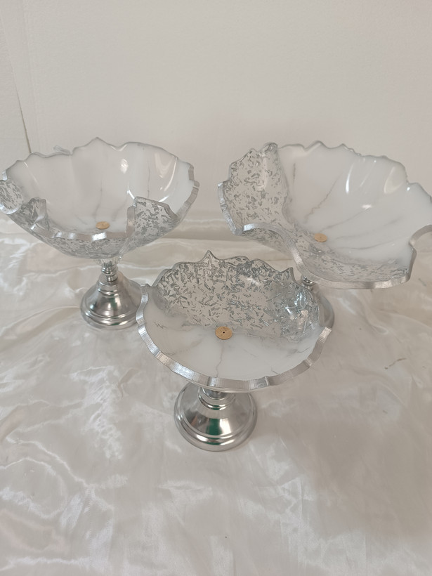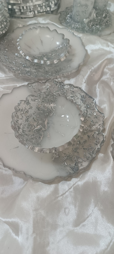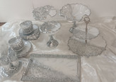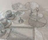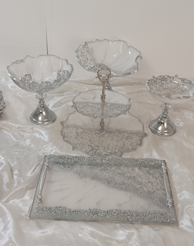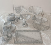 سرویس پذیرایی ۶نفره شامل میوهخوری قطر ۳۰ ،آجیل خوری ،شکلات خوری، یک عدد اردوخوری، ۶عدد پیاله، ۶عدد پیشدستی قطر۲۰، یک عدد سینی و یک عدد شیرینی خوری دو طبقه ابعاد طبقات ۳۰ و ۲۵ سانت و یک عدد جاکاردی دوقلو رزینی میباشد