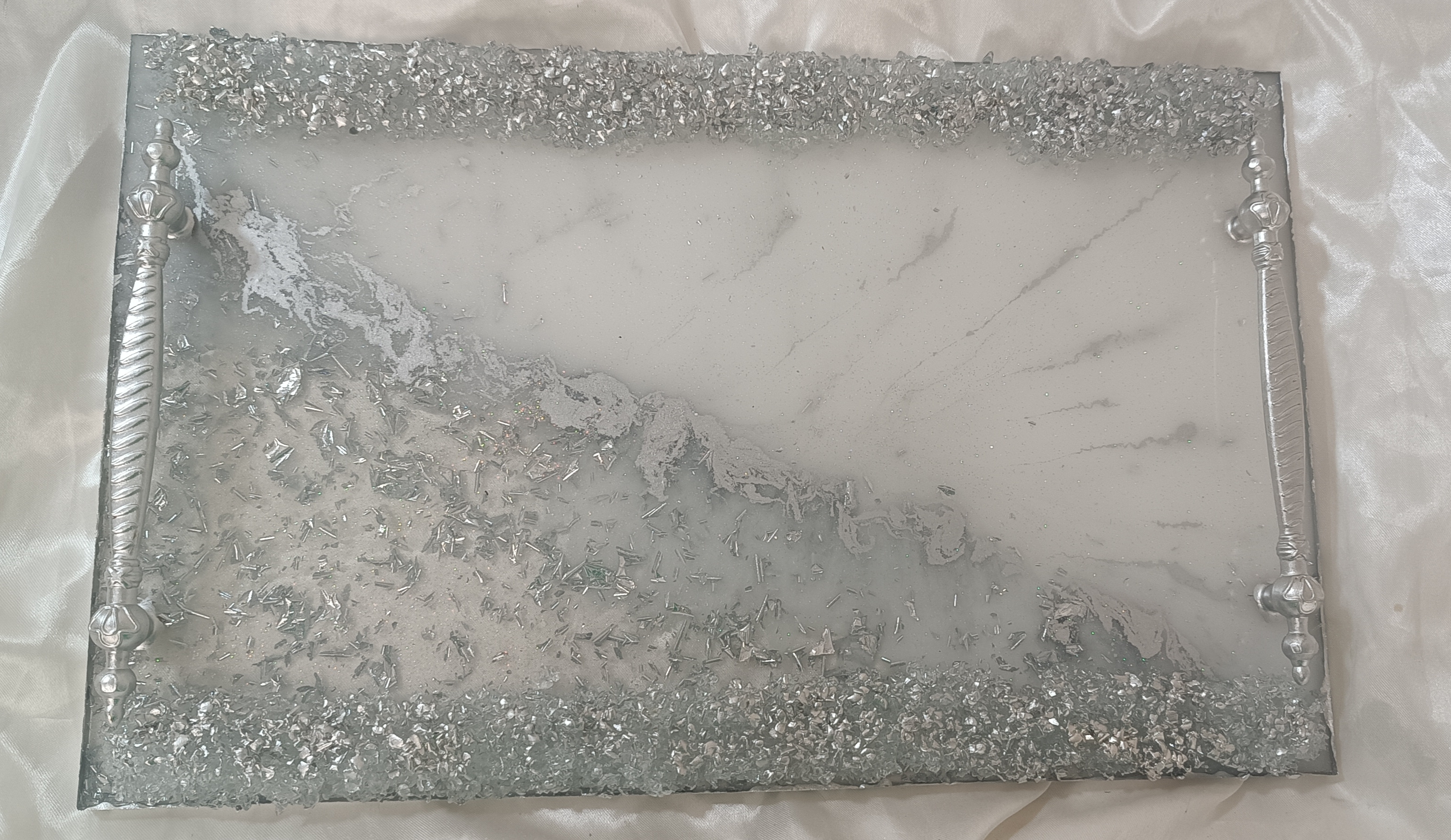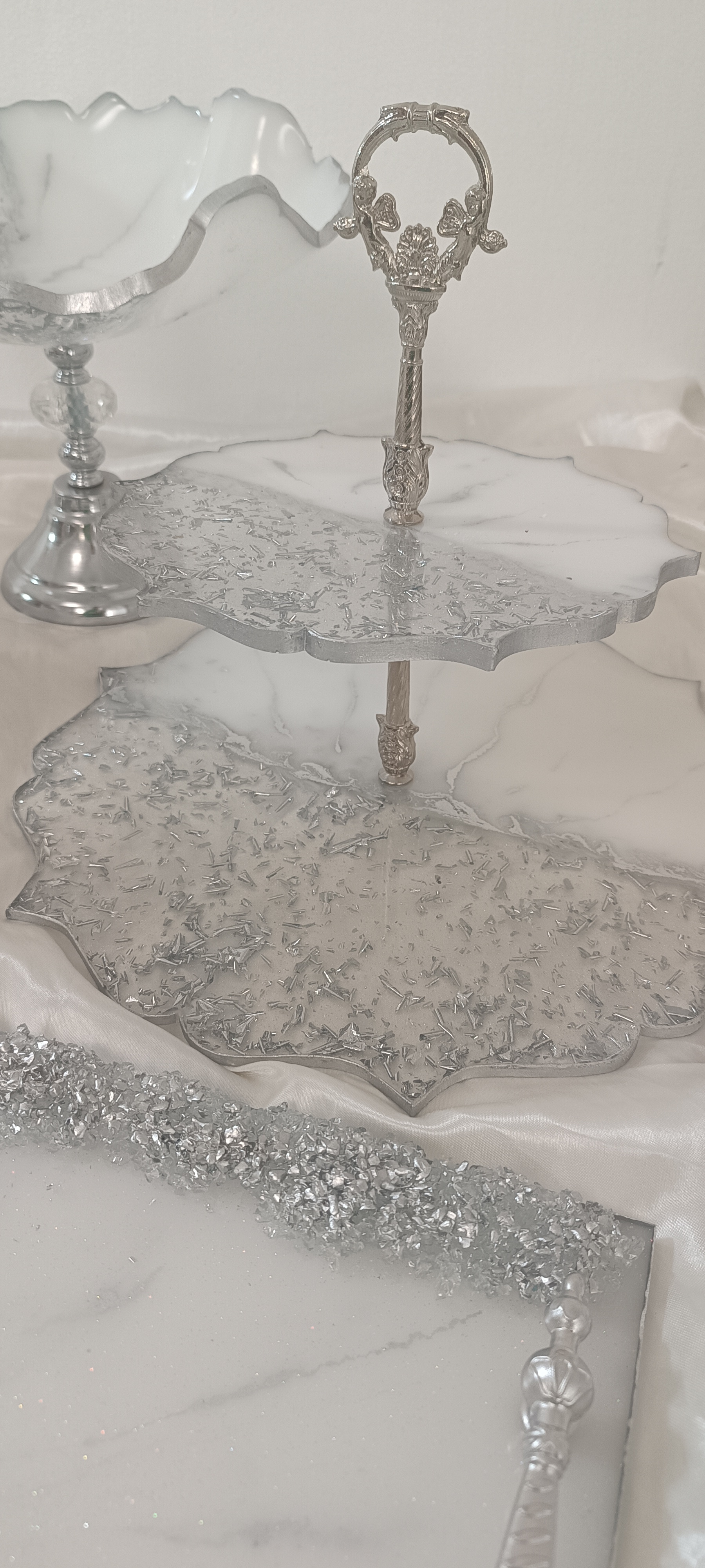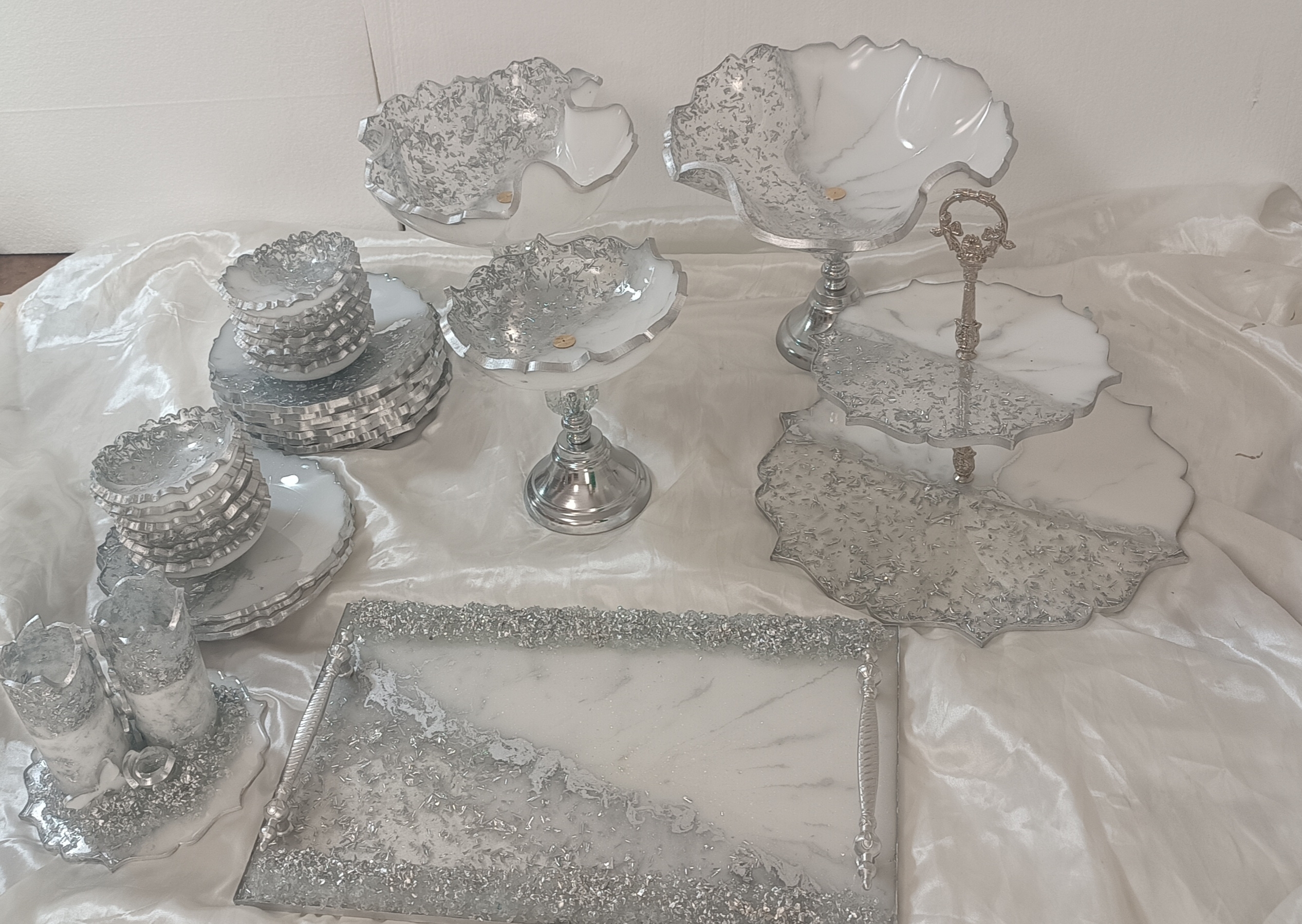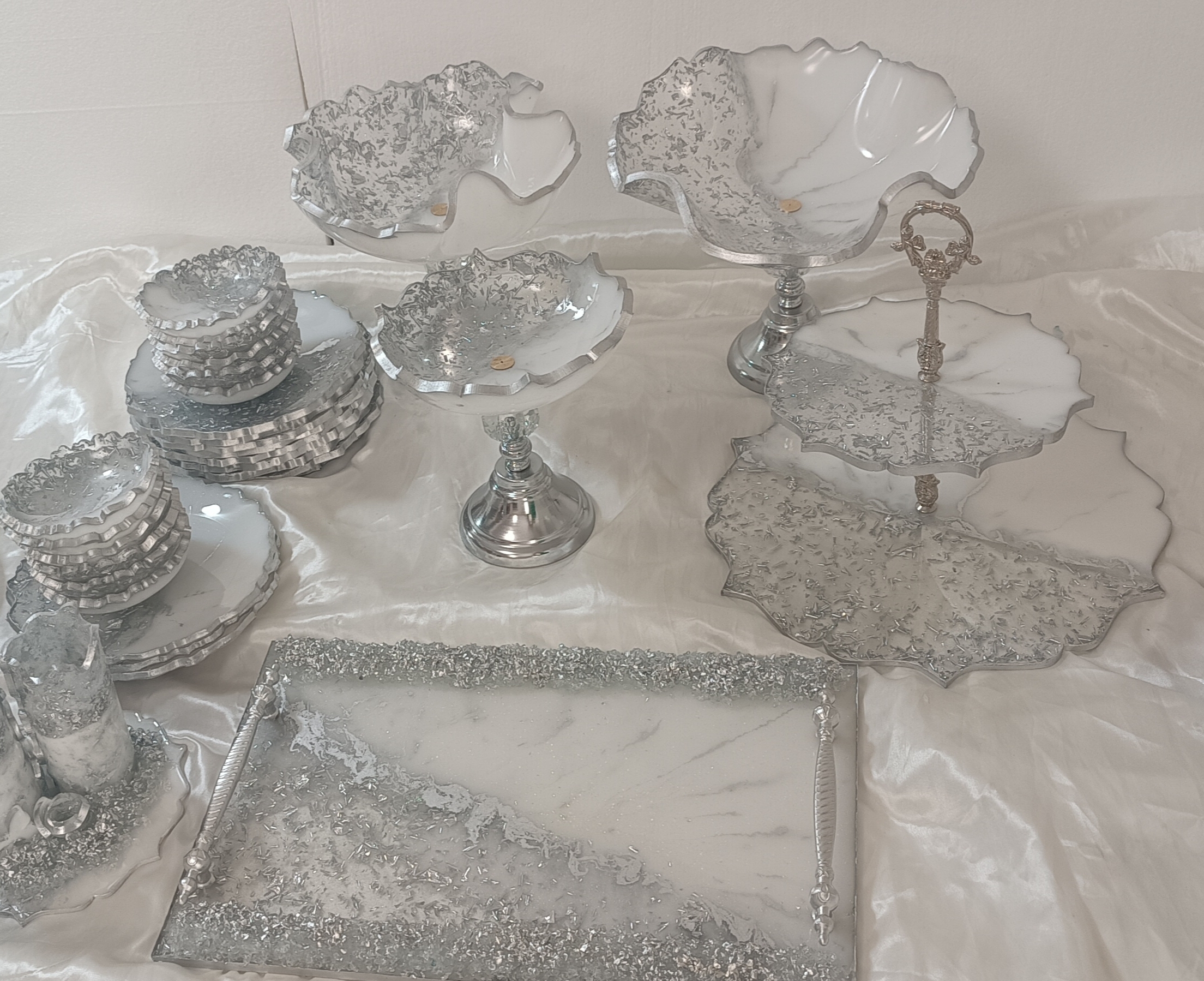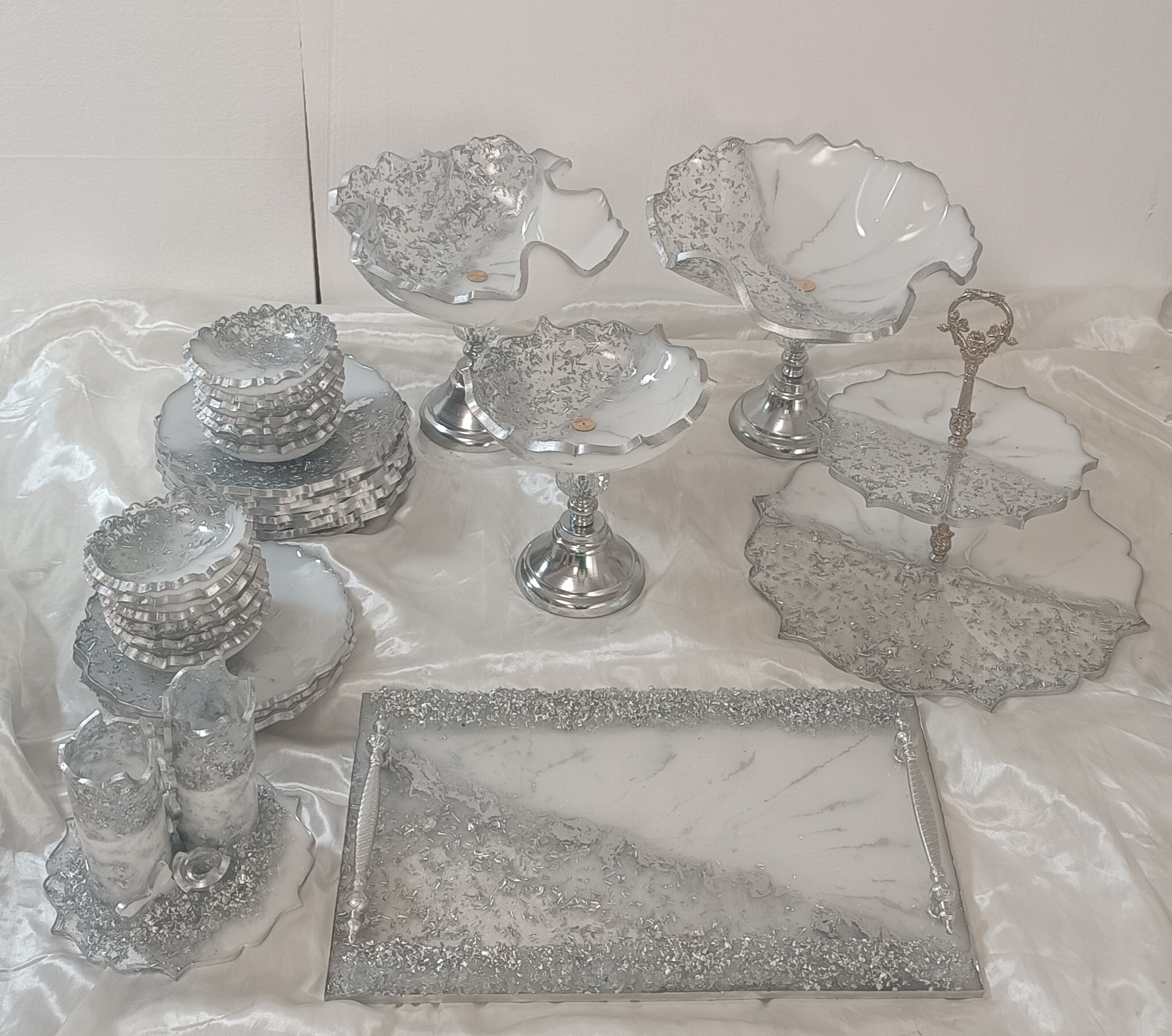 سرویس پذیرایی ۶نفره شامل میوهخوری قطر ۳۰ ،آجیل خوری ،شکلات خوری، یک عدد اردوخوری، ۶عدد پیاله، ۶عدد پیشدستی قطر۲۰، یک عدد سینی و یک عدد شیرینی خوری دو طبقه ابعاد طبقات ۳۰ و ۲۵ سانت و یک عدد جاکاردی دوقلو رزینی میباشد