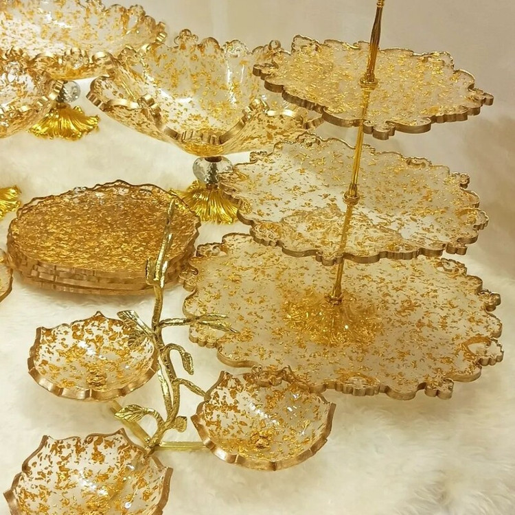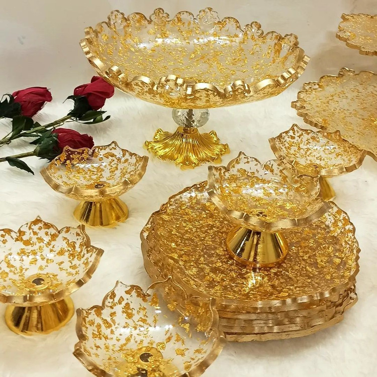سرویس پذیرایی ۶ نفره شامل میوهخوری قطر۳۰ ،آجیل خوری ،شکلات خوری، یک عدد اردوخوری، ۶ عدد پیاله ، ۶ عدد پیشدستی قطر۲۰، یک عدد سینی مستطیل طول۳۰ و یک عدد شیرینی خوری سه طبقه ابعاد طبقات ۳۰ و ۲۵و ۲۰سانت میباشد