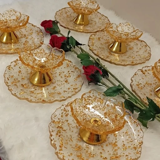 سرویس پذیرایی ۶ نفره شامل میوهخوری قطر۳۰ ،آجیل خوری ،شکلات خوری، یک عدد اردوخوری، ۶ عدد پیاله ، ۶ عدد پیشدستی قطر۲۰، یک عدد سینی مستطیل طول۳۰ و یک عدد شیرینی خوری سه طبقه ابعاد طبقات ۳۰ و ۲۵و ۲۰سانت میباشد