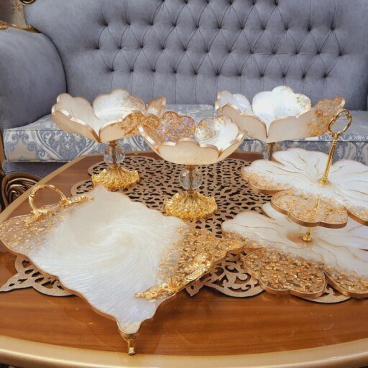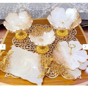 سرویس پذیرایی شامل میوهخوری قطر ۳۰،آجیل خوری ، شکلات خوری ،یک عدد شیرینی خوری دو طبقه ابعاد طبقات ۳۰ و ۲۵ سانت و یک سینی مستطیل طول۳۰ میباشد