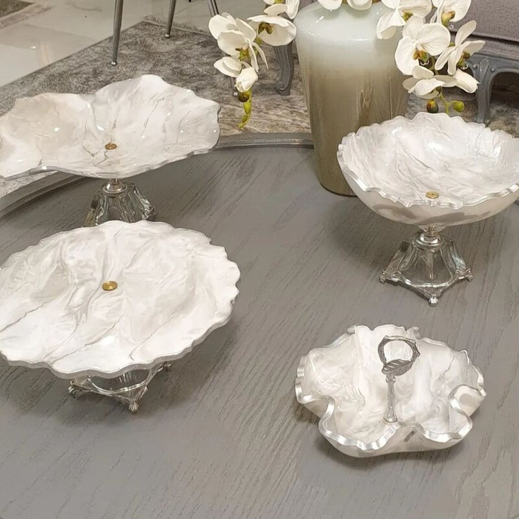 سرویس پذیرایی شامل میوهخوری بزرگ قطر ۴۰ ،آجیل خوری ، شکلات خوری و یک عدد شیرینی خوری دو طبقه ابعاد طبقات ۳۰ و ۲۵ سانت میباشد