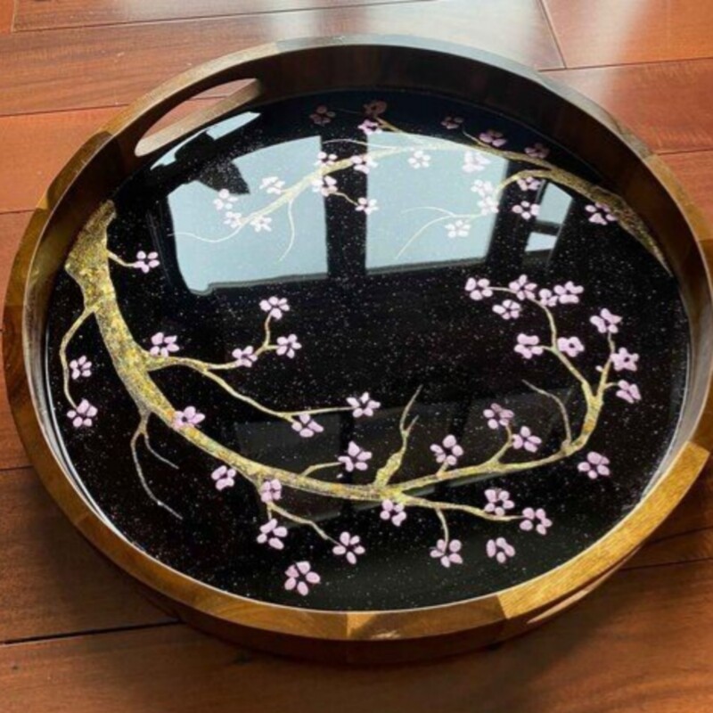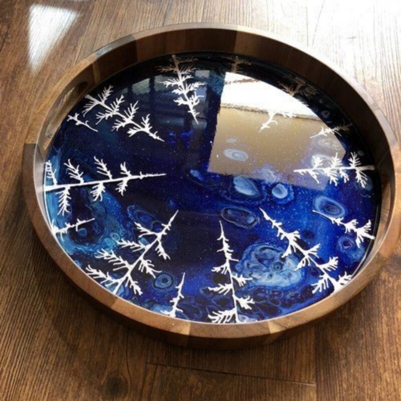 سینی رزینی چوبی یه سینی جذاب و دوست داشتنی که زیر کار رزین درختچه های زیبا کار شده با ورق طلا و نقرس طرح دلخواه هم قابل اجرا رنگ زمینه قابل تغییر به سلیقه شما بدنه سینی در عکس چند رنگ که رنگ بدنه هم قابل تغییر