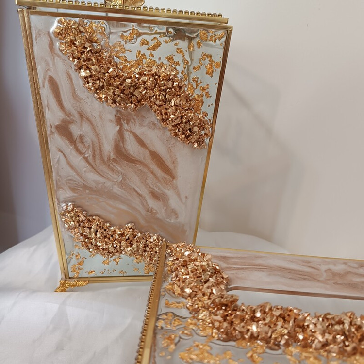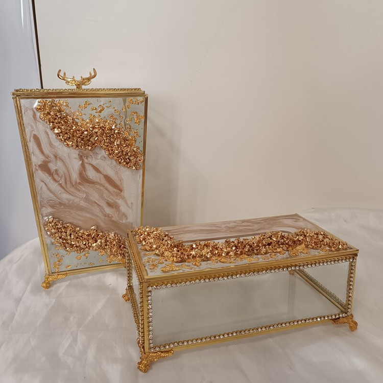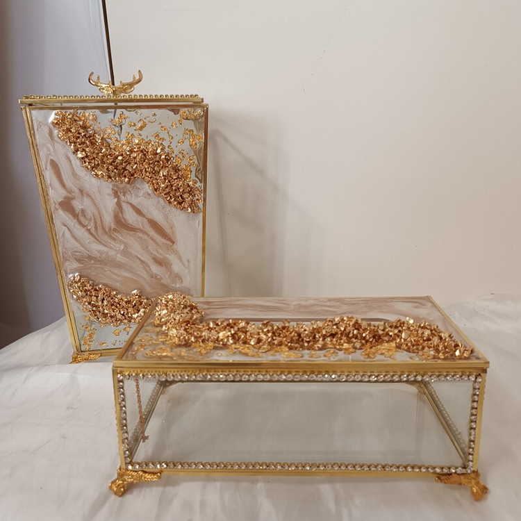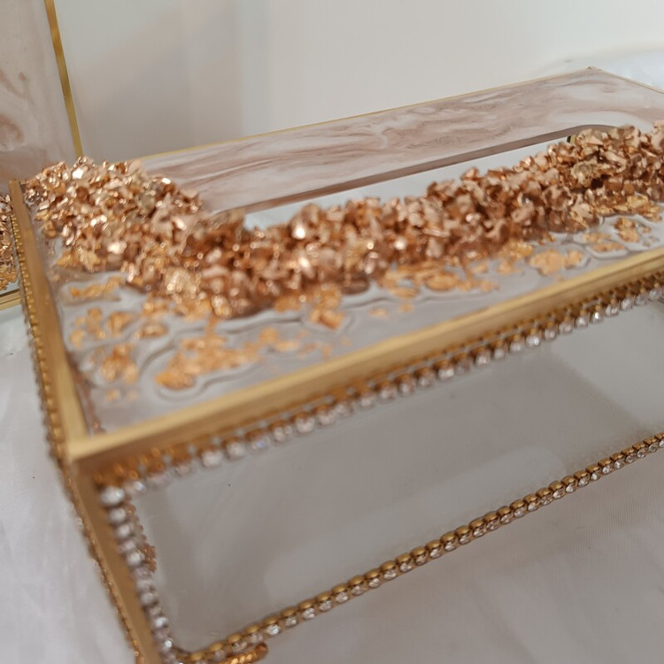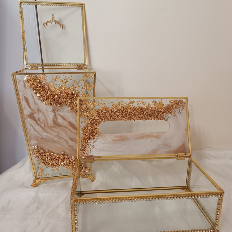 ست و سرویس سطل و جادستمال شیشه ای رزینی نگین کاری کار وارداتی و به مرور اکسید نمیشه ست کار باکس تیبگ،باکس کارد و چنگال،قندان،نقل خوری ،گلدان،جای قرآن،استند دستمال ،و.....موجود و قابل ست کردن با کار