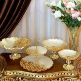 سرویس پذیرایی شامل میوهخوری بزرگ قطر ۴۰ ،آجیل خوری ، شکلات خوری ،یک عدد شیرینی خوری دو طبقه ابعاد طبقات ۳۰ و ۲۵ سانت میباشد