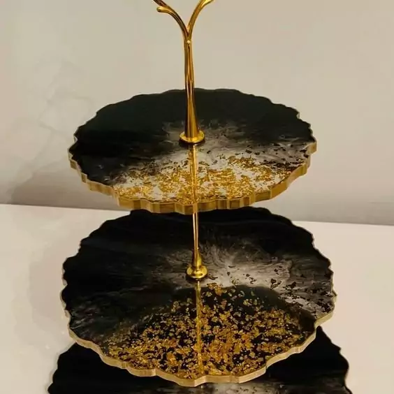 شیرینی خوری دوطبقه رزینی شیک و لاکچری با ورق طلا ب همراه 6عدد زیر استکانی