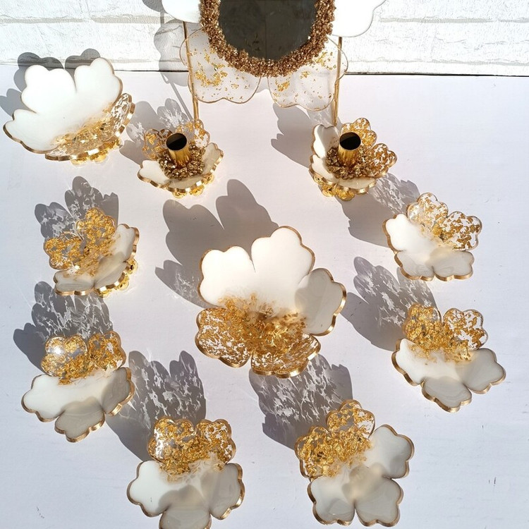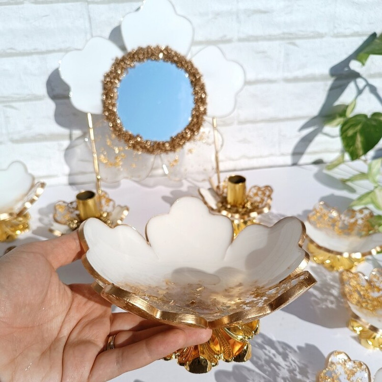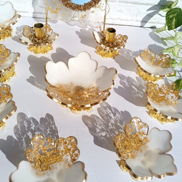 هفت سین رزینی شیک وجدید ۶ عدد کاسه آینه ۲ عددجاشمعی رحل ظرف سبزه ظرف شکلات قابل اجرا در طرح و رنگهای مختلف
