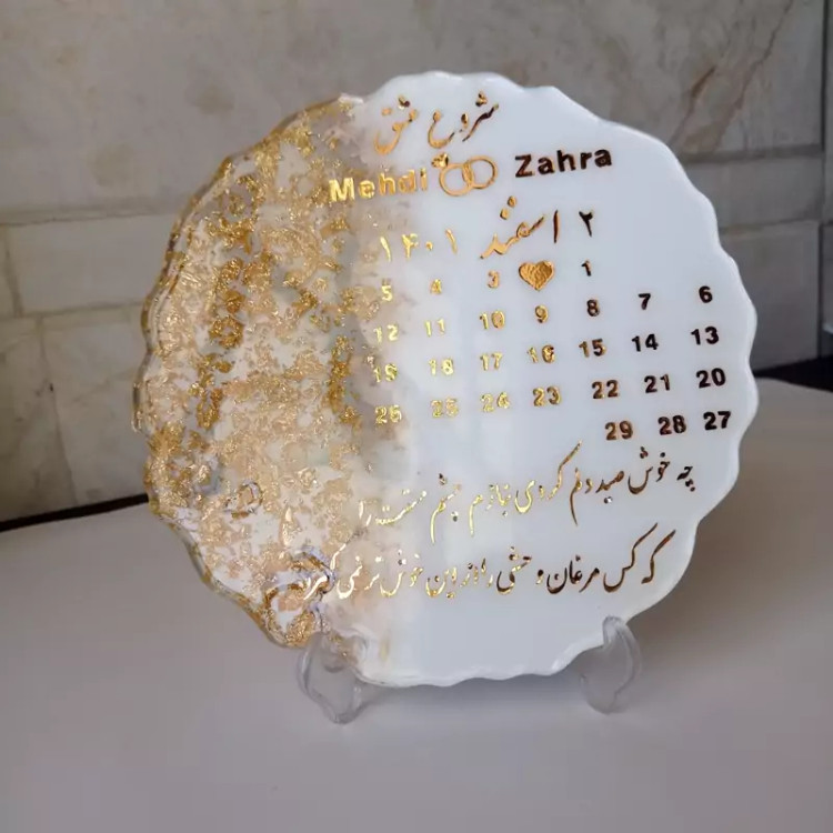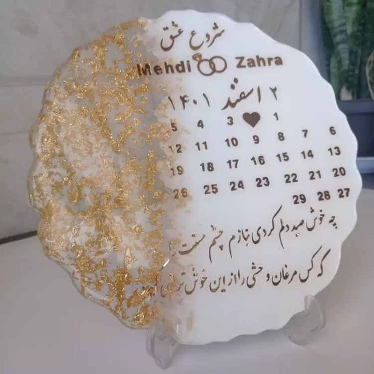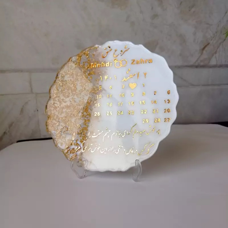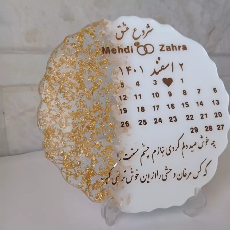 استند یاد بود عقد وعروسی کارشده با ورق طلا و دولایه رزین شفاف قطراین کار ۲۰ سانتی متر می باشد قابل اجرا با طرح ومتن دلخواه شما