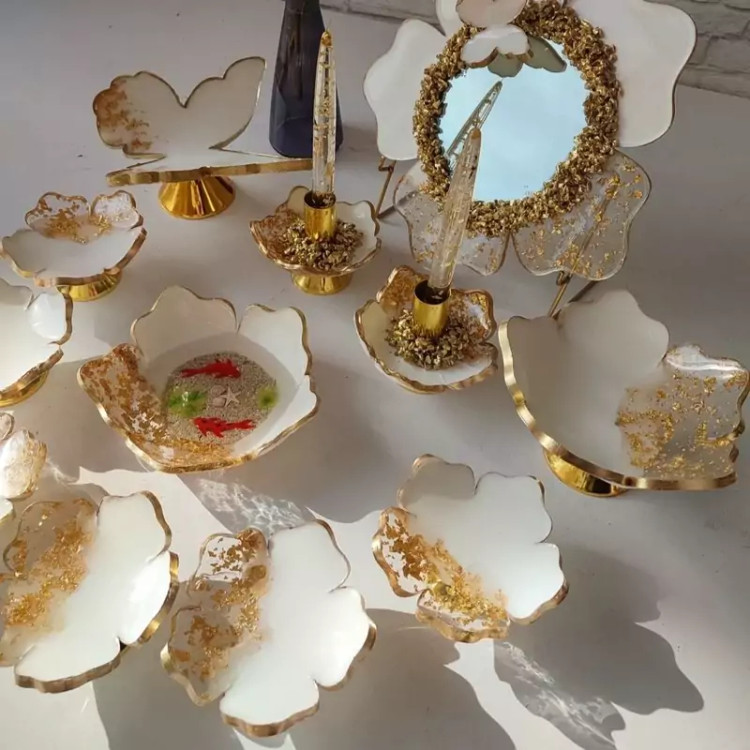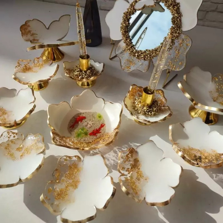 هفت سین رزینی ست هفت سینی کامل ۶ عدد پیاله قطر ۱۳ سانت یک عدد پیاله مخصوص سبزه یا سیب یک عدد حوضچه ماهی رحل قرآن همراه با آینه و دو عدد جاشمعی کارشده با رزین و ورق طلا وپایه فلزی قابل اجرا بارنگ و متریال دلخواه شما برای راهنمایی و سفارش پیام دهید