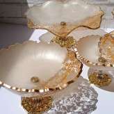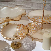 سرویس پذیرایی 4تکه شامل میوهخوری بزرگ قطر ۴۰ ،آجیل خوری ،شکلات خوری، یک عدد شیرینی خوری دو طبقه ابعاد طبقات ۳۰ و ۲۵ سانت میباشد