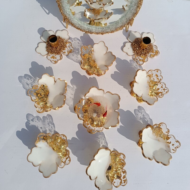 ست هفت سین رزینی شامل ۶ عدد کاسه حوضچه ماهی آینه و دو شمعدان ست سفید طلایی شیک ولاکچری