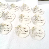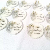گیفت رزینی قطر ۵ سانت کارشده با ورق نقره و گل عروس قابل سفارش در سایز و رنگهای مختلف سبک و نشکن