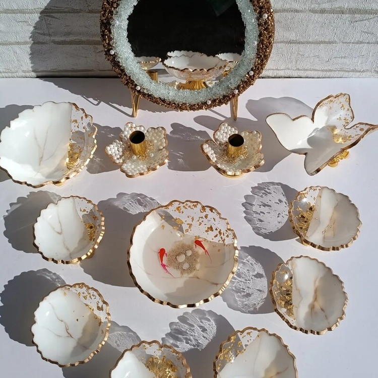 هفت سین رزینی ست کامل مرواریدی آینه ۲ عددجاشمعی ۶تاکاسه طرف سبزه ظرف ماهی رنگ قابل تغییر می باشد