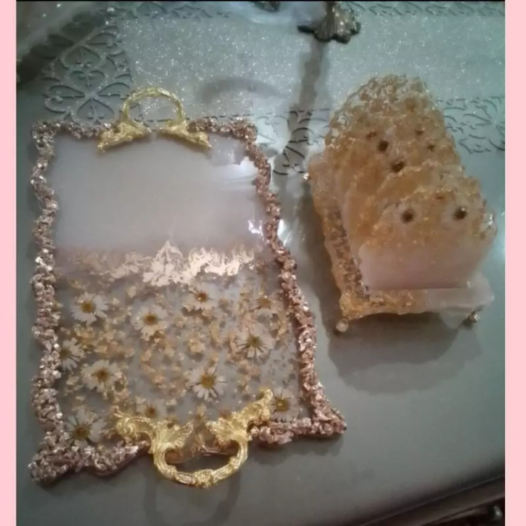 سینی چای رزینی بابونه ب همراه ۶ زیر استکانی بابونه جهیزیه عروس