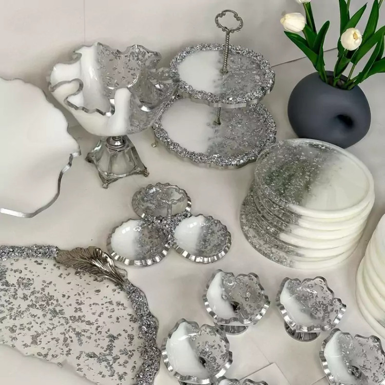 سرویس پذیرایی۶نفره شامل میوهخوری قطر ۳۰ ،آجیل خوری ،شکلات خوری، یک عدد اردوخوری، ۶عدد پیاله ، ۶عدد پیشدستی قطر۲۰، یک عدد سینی گرد قطر۳۰و یک عدد شیرینی خوری دو طبقه ابعاد طبقات ۳۰ و ۲۵ سانت میباشد